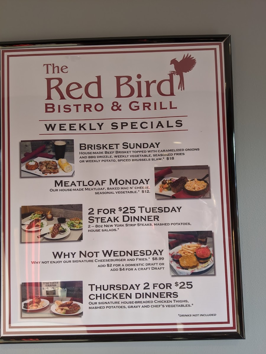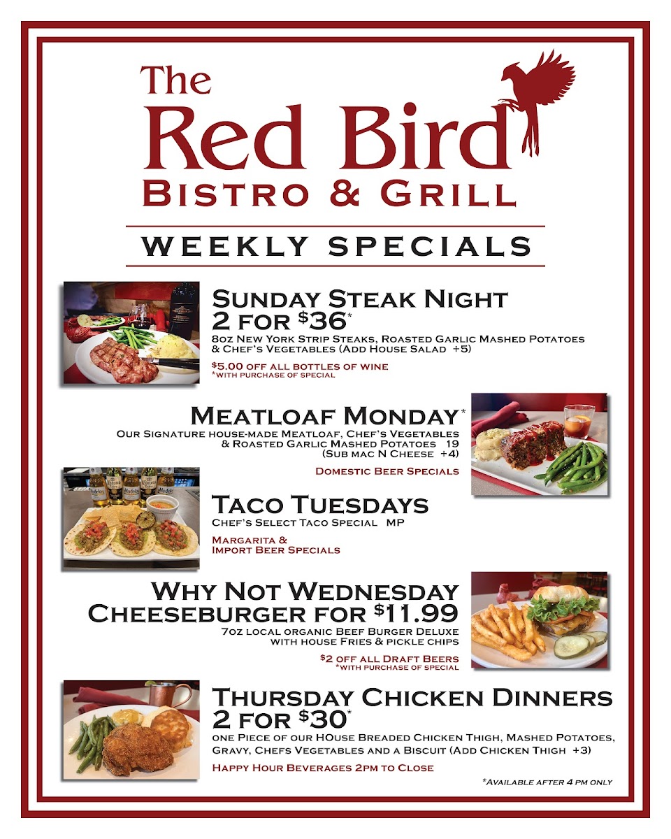 Welcome to The Red Bird Bistro & Grill, a hidden gem nestled at 22 N Main St NE in Cedar Springs, MI. This delightful bistro offers a cozy atmosphere where flavors take center stage. The menu features crowd favorites like the signature Meatloaf on Meatloaf Mondays, boasting house-made greatness accompanied by roasted garlic mashed potatoes. Taco Tuesdays and Thursday Chicken Dinners highlight the chef’s creativity, ensuring there’s something for everyone.